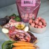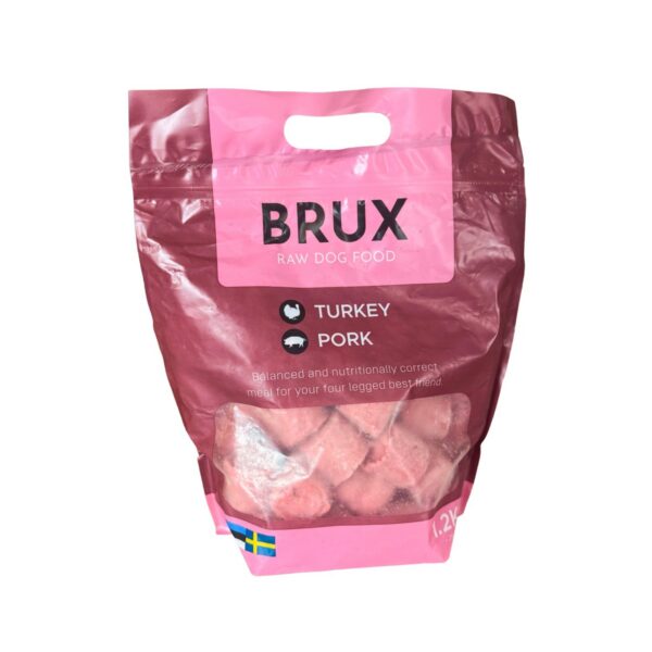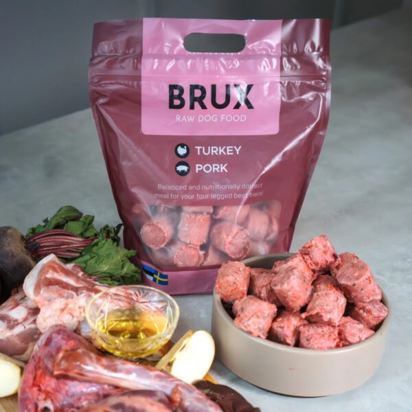 Kalkun ja Siga Kalkun 45% (liha + luu 35%, lihasmagu 5%, maks 3%, süda 2%), siga 40% (liha 20%, kops 12%, süda 5%, maks 3%), lõhe 7%, puu- ja köögiviljasegu 7,4%, kamelina õli 0,6%.