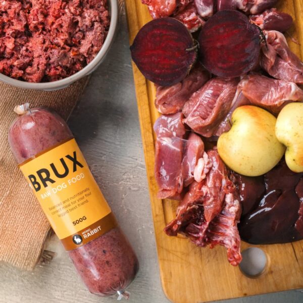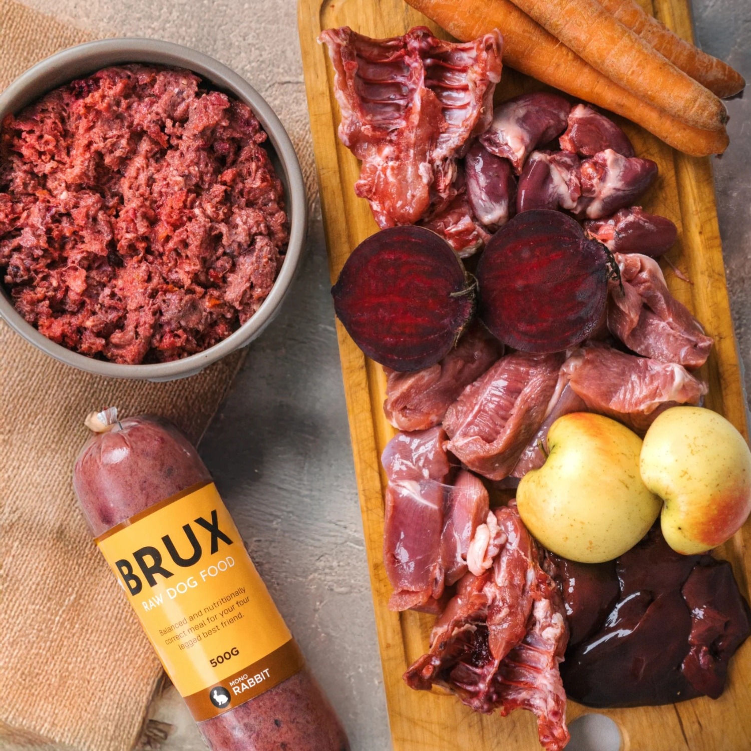 Küülik 85% (liha 55%, luu ja karkass 18%, süda 7%, maks 5%), puu- ja köögiviljasegu 15%.
