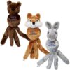 Saadaval kolm erinevat mänguasja: karu, rebane ja jänes.