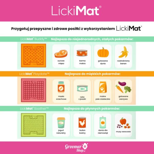 Sobib ideaalselt LickiMat Classic (pehmetele) ja Tuff (kõvadele) mattidele: Buddy, Playdate ja Soother.