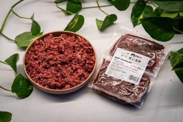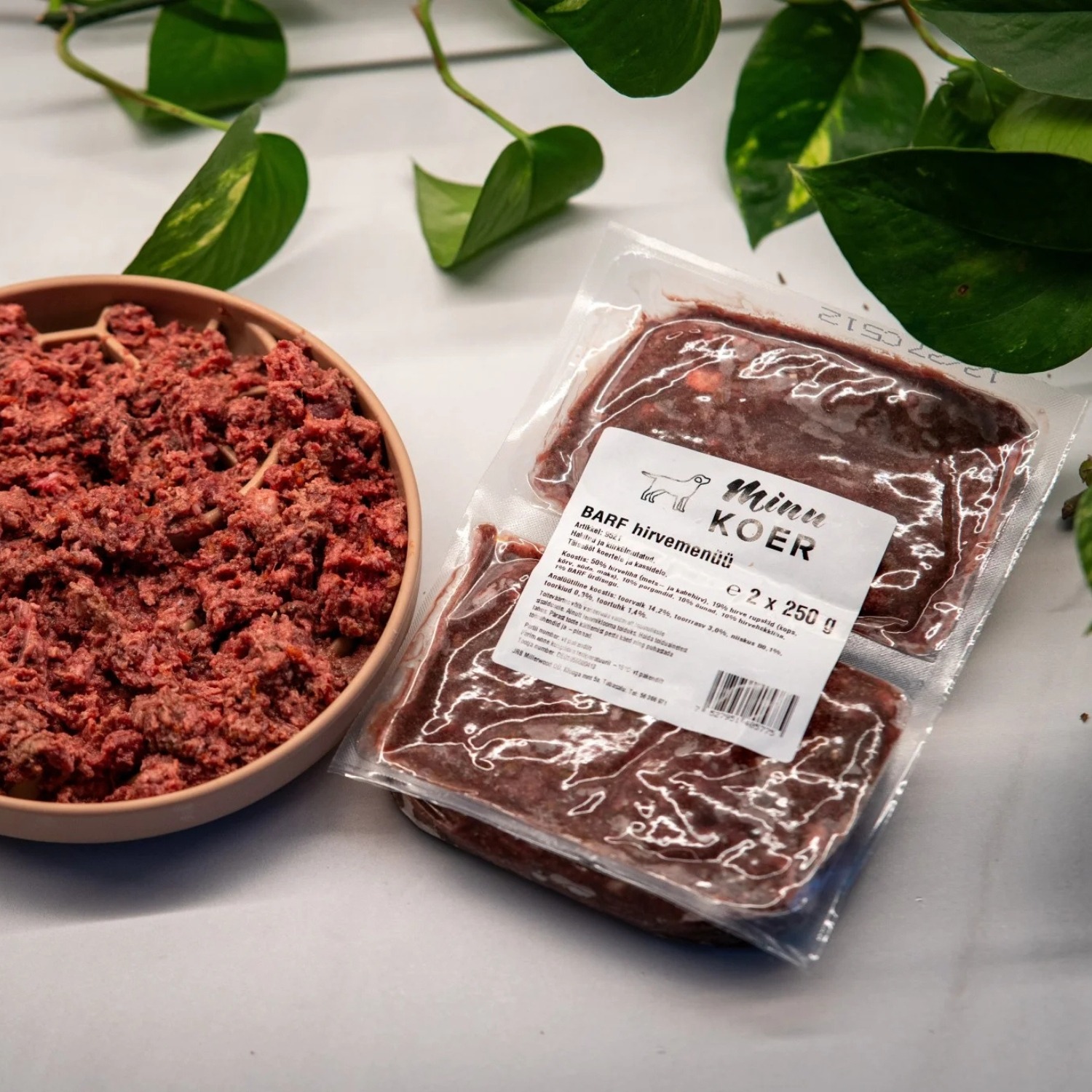 Koostis: 50% hirveliha (mets- ja kabehirv), 19% hirve rupskid (kops, kõrv, süda, maks), 10% porgandid, 10% õunad, 10% hirvehakkliha, 1% BARF ürdisegu.