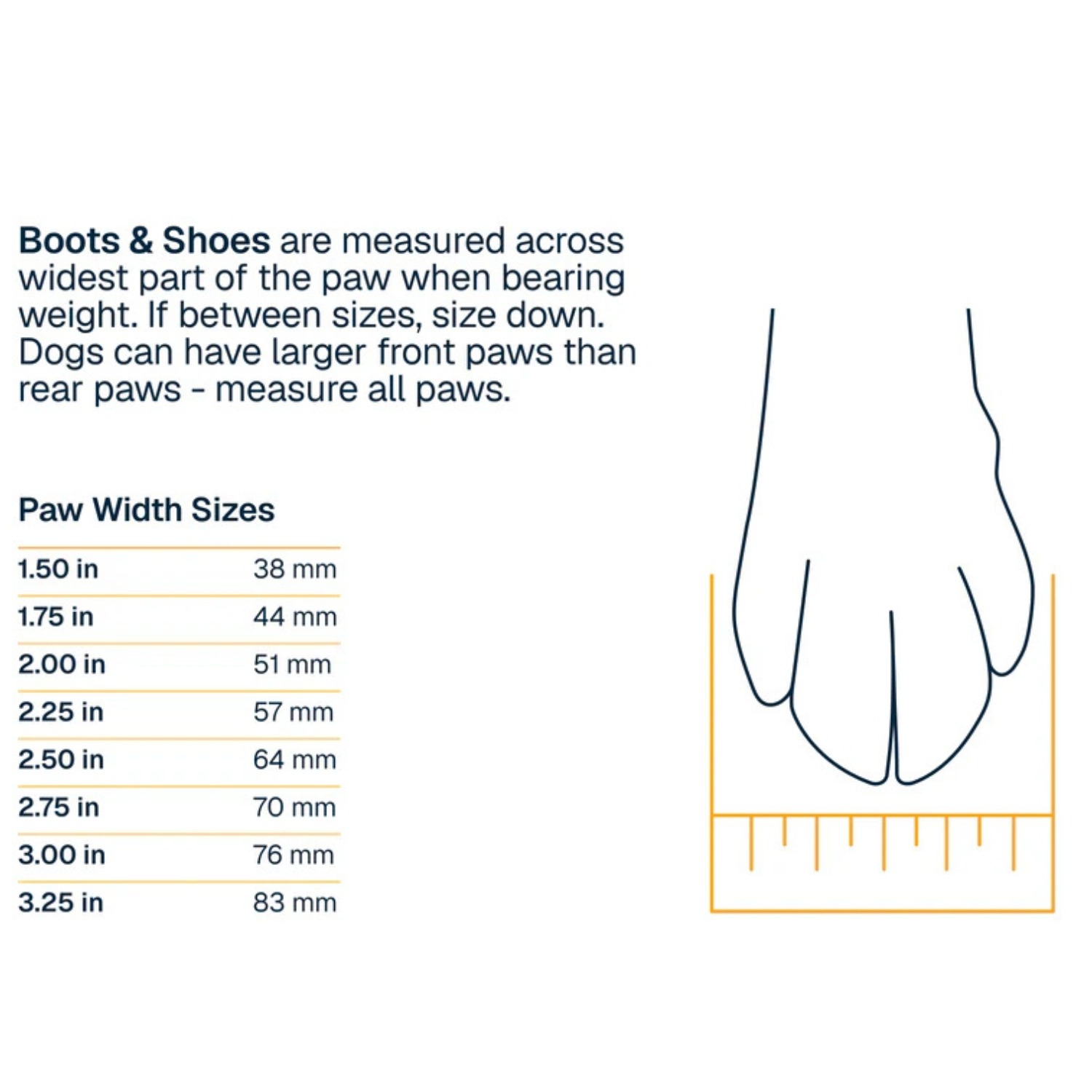 Õige suuruse leidmiseks mõõtke käpa laius kõige laiemast osast: