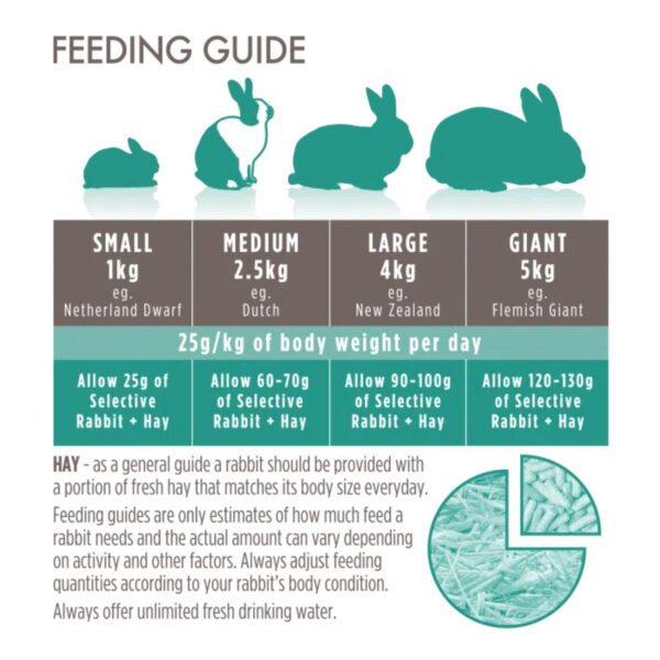 Täiskasvanud küülik (2,5 kg) vajab päevas tavaliselt 60-70g valiktoitu Selective Rabbitit.