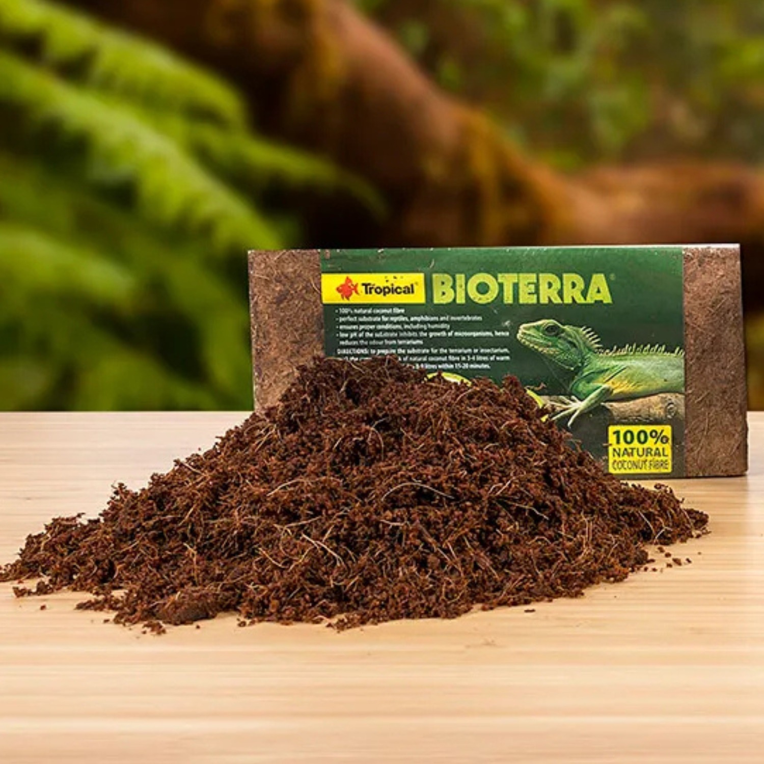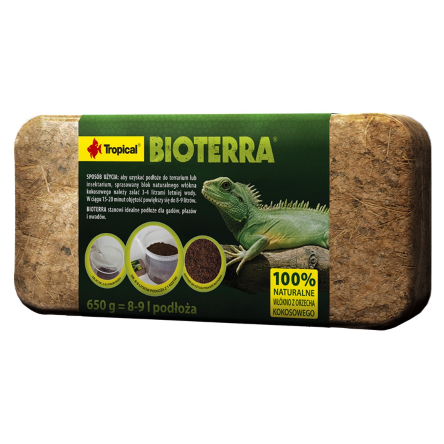 Terraariumi või insektaariumi allapanu saamiseks tuleb looduslik kookoskiu pressplokk kallata üle 3-4 liitri sooja veega.